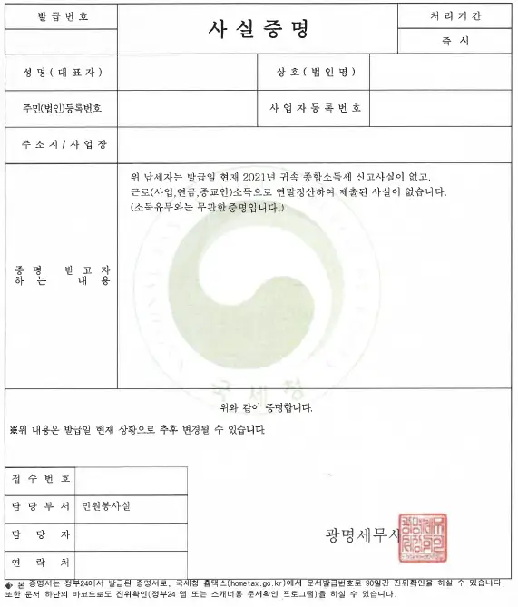 - 소득이 없을 경우, ‘신고사실없음’ 사실증명원 제출 (홈택스 발급)