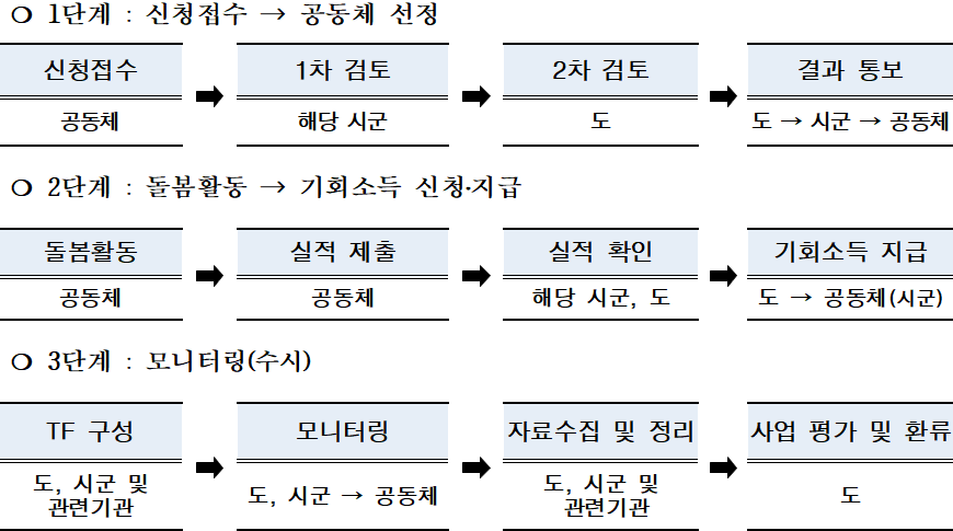 - 공동체 구성원이 직접 해당 시군 및 경기도에 제출하는 게 아니며, 내부 운영회의를 통해 기여도 등을 종합적으로 고려, 지급 인원수에 따라 지급 대상자를 결정하여 공동체 대표가 제출함