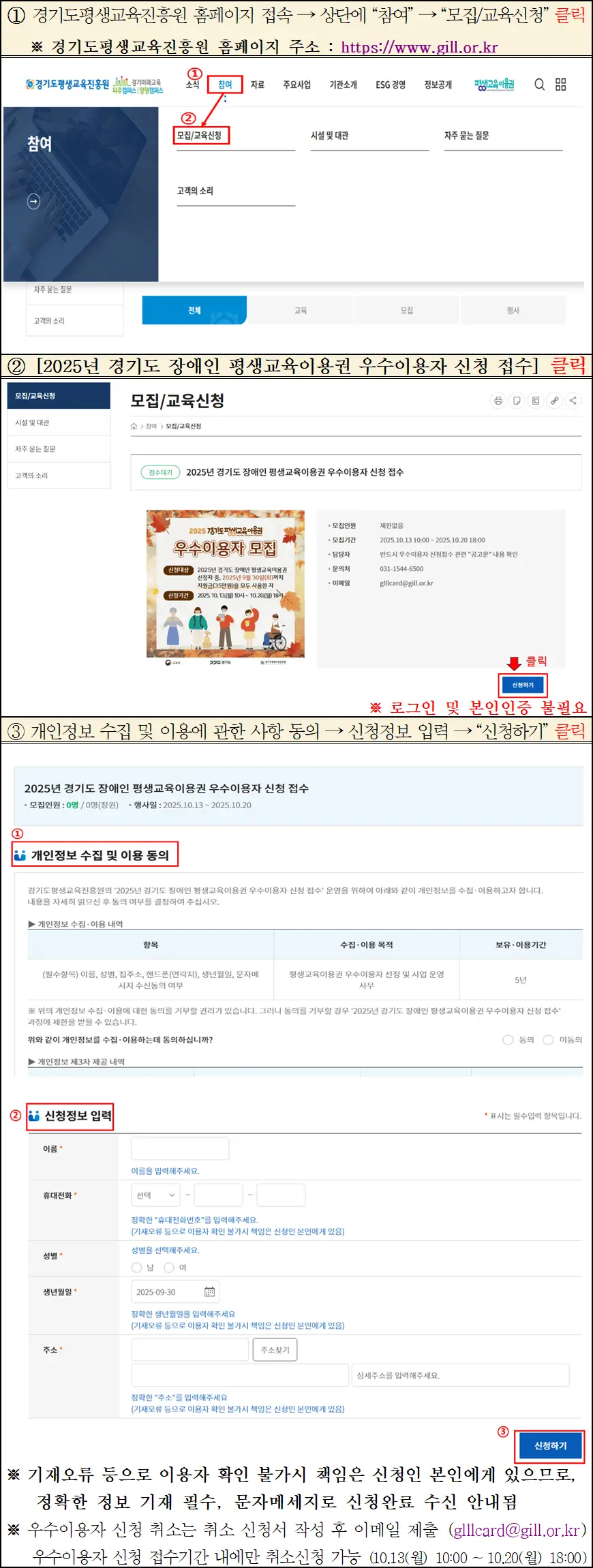 ※ 홈페이지 접속 → 참여 → 모집/교육신청 → 2025년 경기도 장애인 평생교육이용권 우수이용자 신청 접수