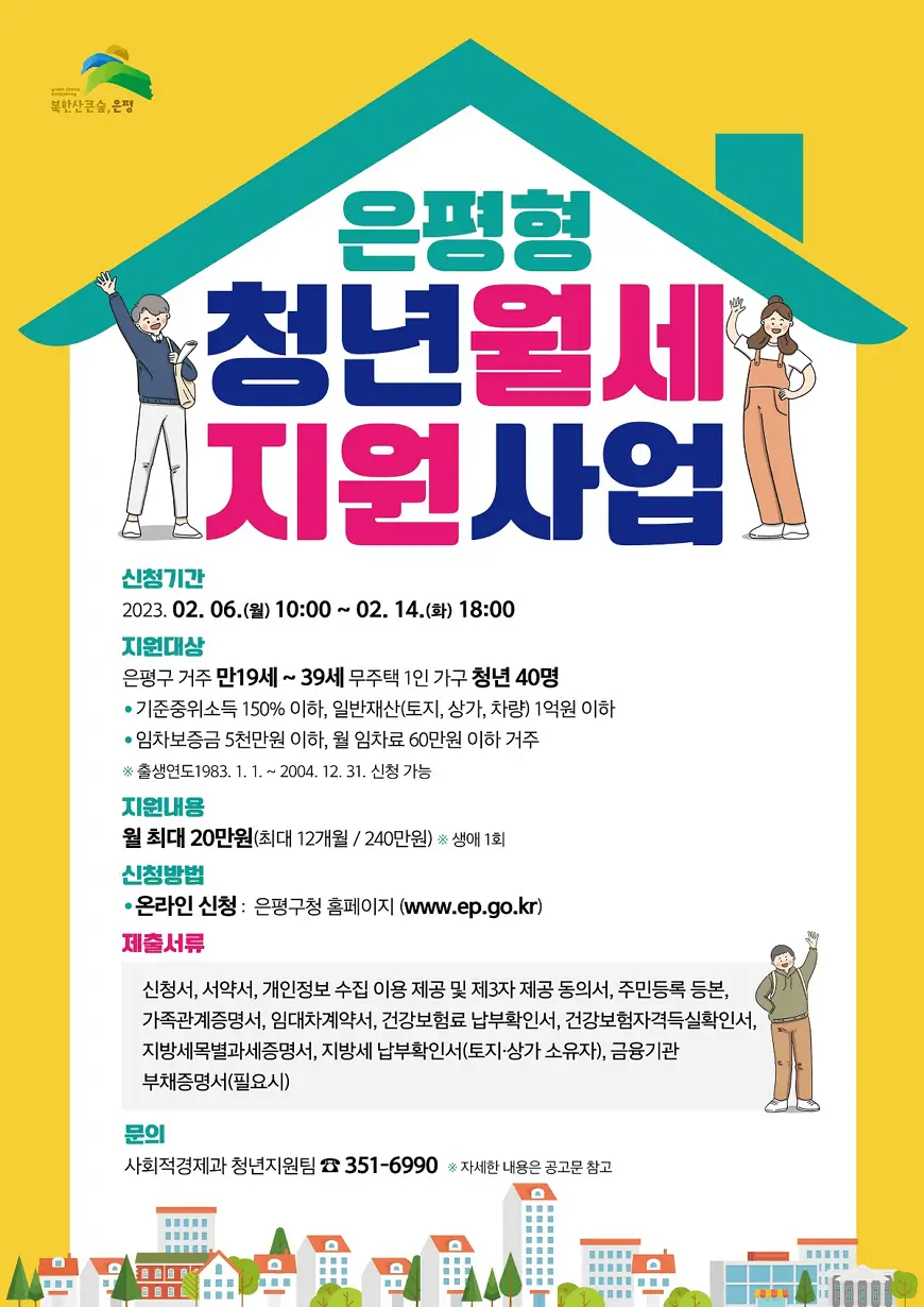 서울특별시 은평구에서는 청년의 주거비 부담을 완화하고 주거 안정을 지원하기 위해 아래와 같이 은평형 청년월세 지원사업 참여자를 모집합니다.