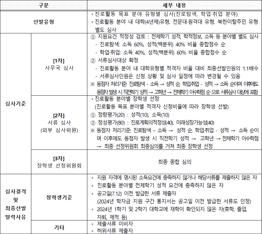 | 지원성격 | 학업장려금 (중복지원 방지 비대상인 생활비 등 명목의 장학금), 등록금 지원 명목의 교내·외 장학금과 중복 수혜 가능 |