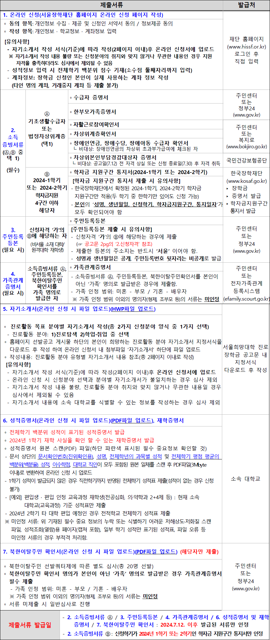 | 나 | 소득 기준이 아래 ①, ② 중 하나에 해당하는 자 ① 기초생활수급자 또는 법정차상위계층 ② 2024-1학기 또는 2024-2학기 한국장학재단 학자금지원구간 통지서 4구간 이하 ※ 온라인 신청 시 ①, ② 중 하나에 해당하는 증빙서류를 업로드하여 이를 증명해야 함 ※ 두 학기 중 한 학기만 4구간 이하이면 지원 가능 |