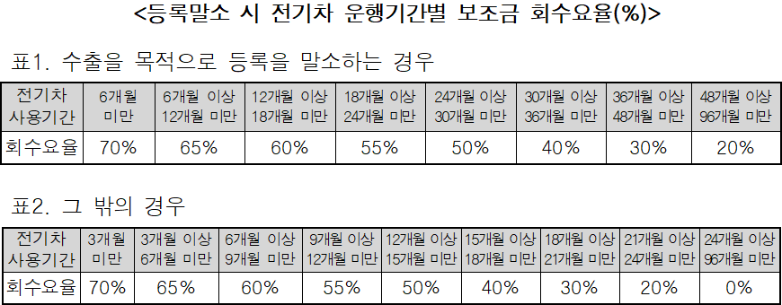 – 의무운행기간을 충족하지 못하고 차량 등록 말소할 경우 원칙적으로 보조금 환수하되, 교통사고나 천재지변 등 불가피한 사유인 경우 제외 가능