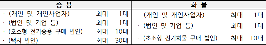 (경형ㆍ소형) 개인사업자ㆍ법인이 2년 이내 2대 이상의 전기차를 구매하려는 경우 민간보조사업을 통해 국비만 지원하고 ‘재지원제한기간’ 미적용