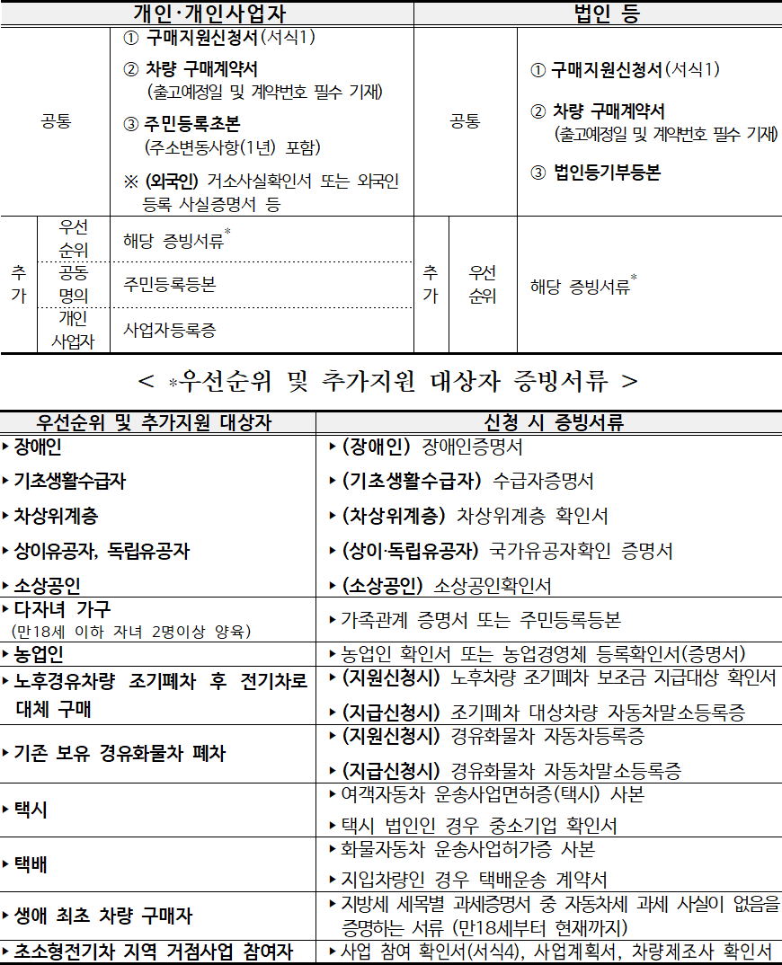 ※ 이용자명의 리스 등과 같이 차량등록증 상 명의가 개인 (구매자)인 경우 개인구매 기준 적용 (단, 계약서 등을 통해 보조금 회수의무 이행주체를 명확히 지정하고, 증빙자료 제출하여야 함)
