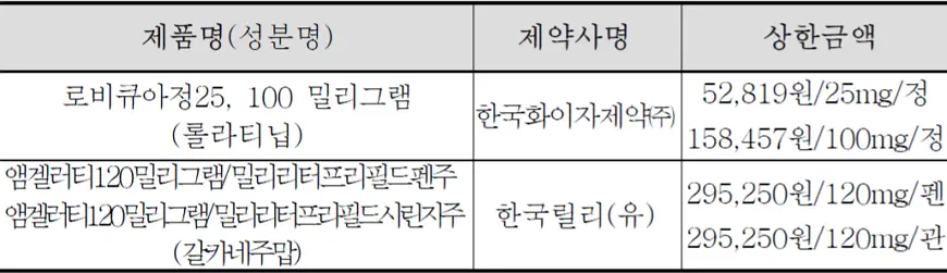 1. 로비큐아정 등 2개 의약품 (4개 품목)의 요양급여대상 여부 및 상한금액이 결정되어 건강보험이 신규로 적용된다. (2022.9 ~)