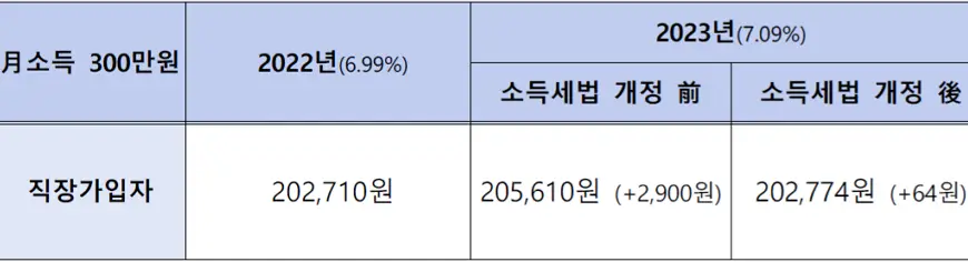 – (소득세법 개정 前) 보험료율 1.49% 조정으로 월 보험료가 20.27만원 (290만원의 6.99%) ➜ 20.56만원 (290만원의 7.09%)으로 0.29만원 인상